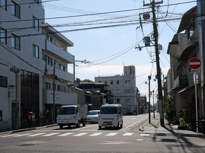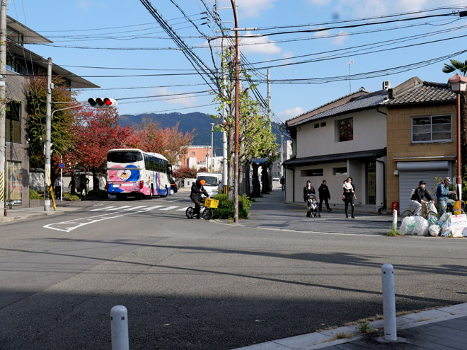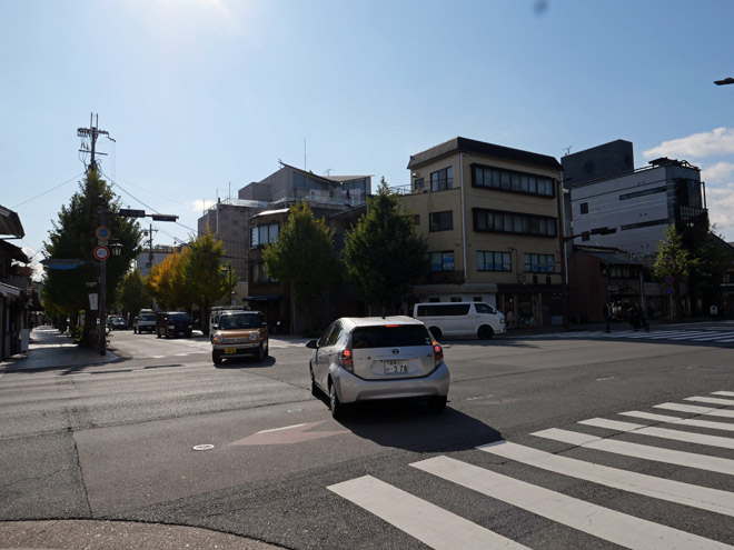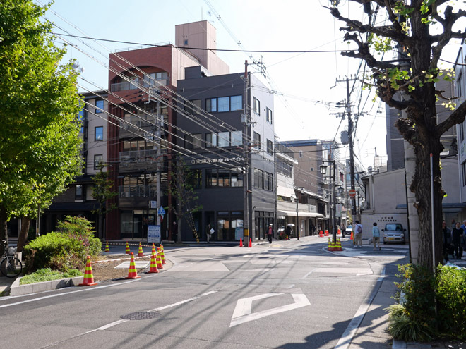 二条を河原町を越えて木屋町までやってきました。左手前から右にかけてのカーブが広くなっているのも京電の名残です。