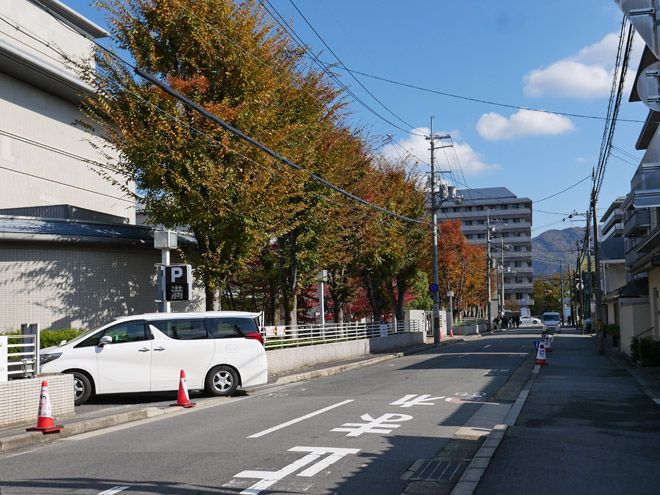広小路の突き当りが京都府立医大。手前には立命館の広小路キャンパスがありました。現在は府立医大で、白い車が入っている駐車場は、わたしも3ヶ月に1回の検診に際に利用しています。