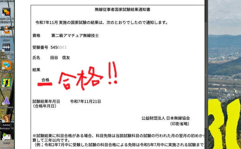 第二級アマチュア無線技士国家試験の合否発表が行われました。連絡されてきたメールに従ってダウンロードしたPDFファイルを開けると、「合格」の文字がありました。