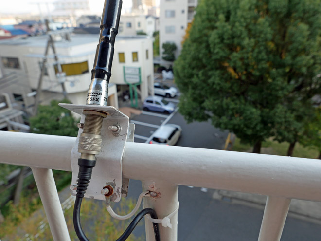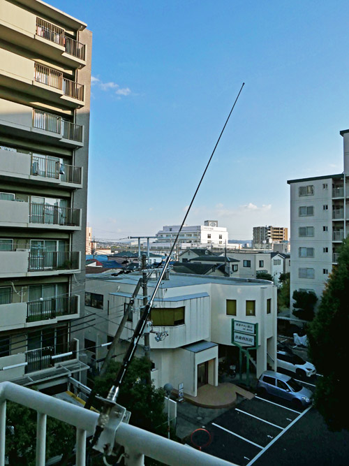 マンションの4階に住んでいます。アパマンハムとしては、大きなアンテナの設置など望むべくもありません。長さ1.2mほどの釣り竿のようなアンテナ(21MHz用)を、ベランダからちょいとのぞかせて運用しています。