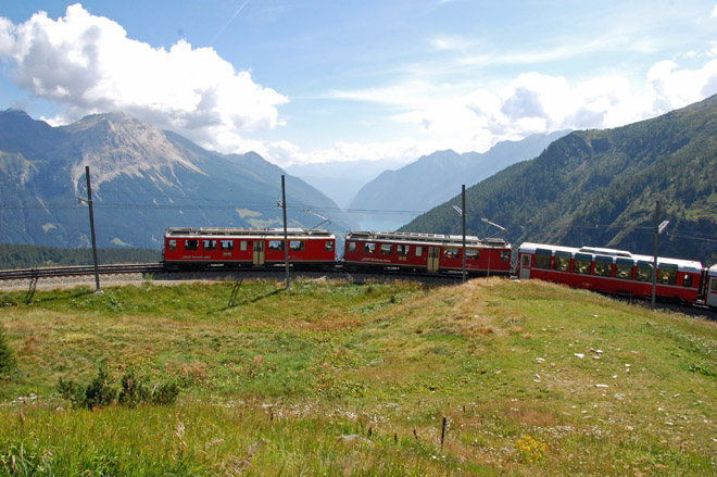 スイス・レーティッシュ鉄道のベルニナ線に、イタリア北東部のティラーノから乗り込みました。オープン・ループ橋や山上湖、雄大な氷河などのアルプスの絶景を楽しみ、中間のアルプ・グリュムで途中下車しました。走りすぎるにはもったいない時間でした。