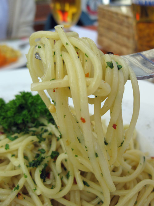 駅舎につながるレストラン「WeissbierGarten」に直行しました。「アーリオ・オーリオ・ペペロンチーノ」です。