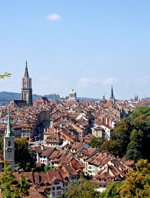 アーレ川に囲まれたスイスの首都、ベルンです。中世の美しい街並みが残る旧市街を突っ切り、ニーデック橋を渡って急坂を登ったことろにバラ公園がありました。