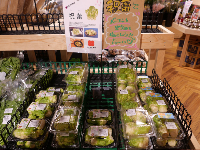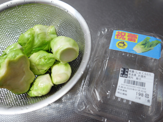 祝蕾と書いて「しゅくらい」です。奈良の種苗メーカーが、子持ち高菜といわれている野菜を育成して命名しました。アブラナ科の一種で高菜と同じ仲間だそうです。