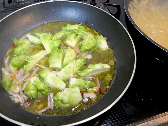 ペペロンチーノのオイルに白ワインと茹で汁を入れて、祝蕾をボイルしました。