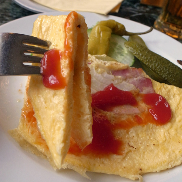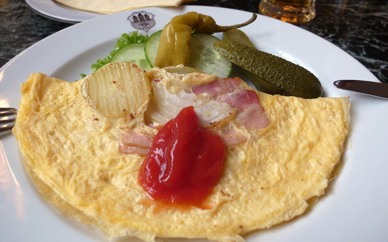 市民会館のカフェ「カヴァールナ・オベツニー・ドゥーム」でいただきました。ワンプレートにのったボヘミアン・オムレツです。