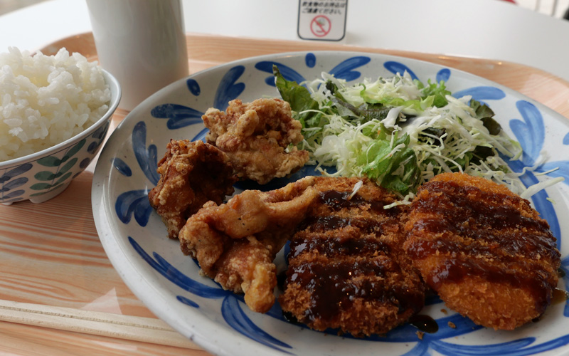 コロッケと白身フライ、鶏のから揚げのワンプレートです。汁気がほしかったっですが、ぜいたくはいいません。このお味。この価格からすれば十分に満足です。