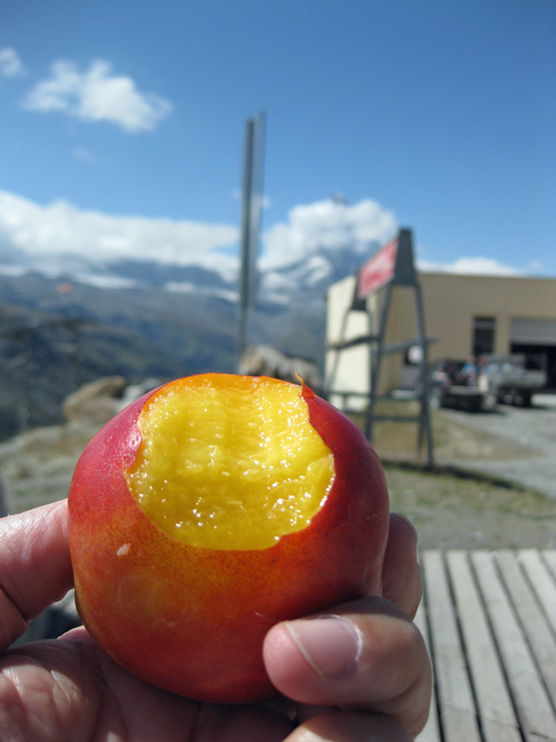 テーブルに座り込んで、最高の気分で昼飯にしました。丸のままかじるアンズが甘かったです。
