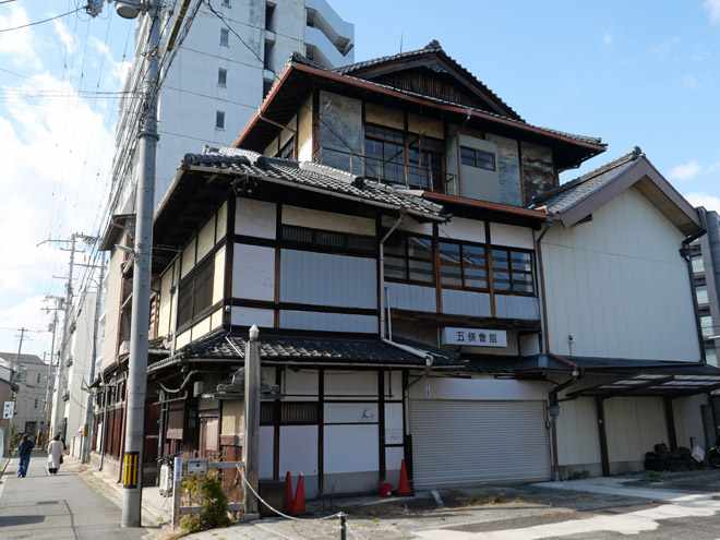 五条会館(五條會館歌舞練場) は大正6(1917)年に建てられた木造3階の伝統的建造物です。旧花街のシンボルでした。