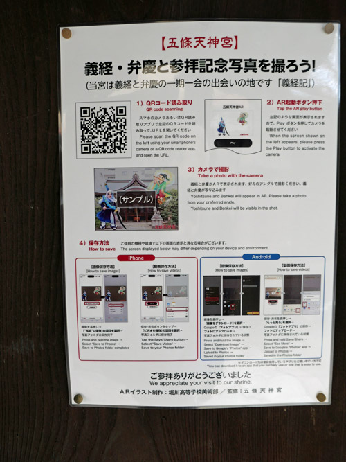 牛若・弁慶の時代はここの近くに五條橋が架かっていたとも伝わり、「当宮は義経と弁慶の一期一会の出会い地です」と説明されています。その記念写真を撮ろうと、スマホでQRコードを読み取って操作しました。