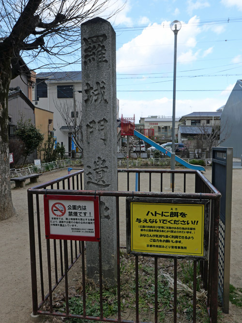 平安京のメーンストリート、朱雀大路の南端にあった大門の跡です。現在は小さな児童公園に石碑が立つだけです。