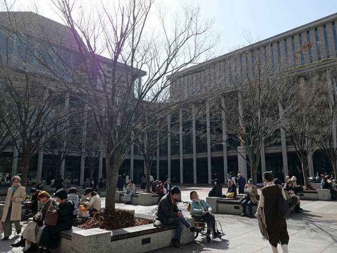 ぽかぽか陽気となった芸文ホール前の広場では、これまでに見たことがないほど多くの人たちがくつろいでいました。