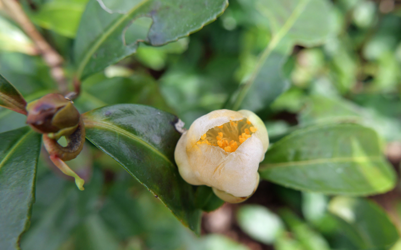 お茶の花を初めて見ました。茶席の床の間に季節感を演出する茶花ではありません。植物としての茶が、子孫繁栄の種子をつくるために咲かせた花です。