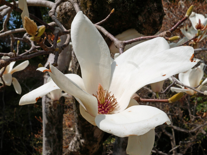 玄関先にハナモクレンが咲いていました。撮影していると、大きな花弁が散り落ちて頭にあたりました。