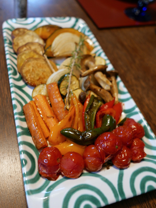 春野菜のグリル焼きです。トマト、ピーマン、パプリカ、ニンジン、ズッキーニ、シメジ、タマネギ、サツマイモ、カボチャと並びました。オーブンで焼いただけです。
