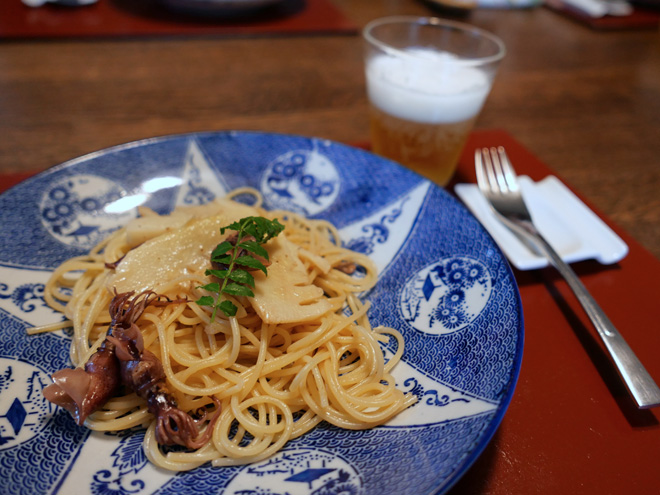 筍とホタルイカのパスタで「本日のおもてなし」