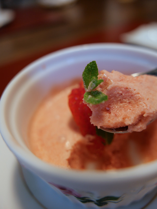デザートは、苺のババロアでした。ゼラチンの量が多かったのか、ちょっと固くなりました。それでも甘さはほどほどで、おいしく締めることができました。