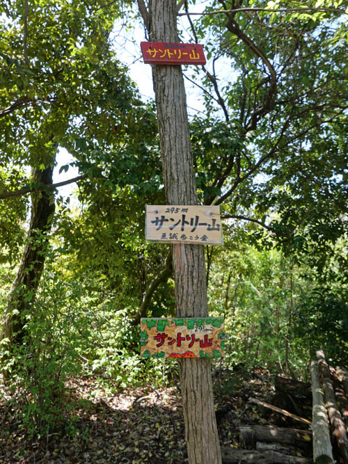 天王山の山頂には行かず、サントリー山に到着です。初めて見るカラフルなプレートがかかっていました。