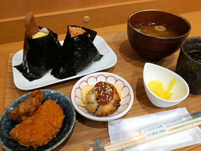 おにぎり2個をチョイス、小鉢2皿、みそ汁、漬け物がついてます。イートイン・コーナーでいただきました。