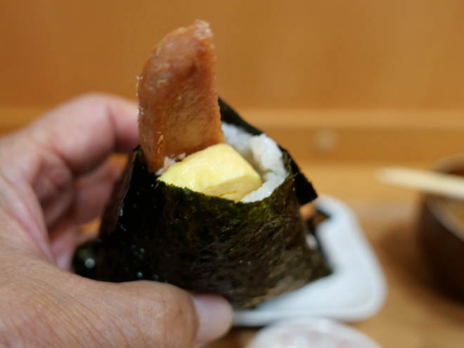 「スパムおにぎり」は1個387円です。デラックス版には、定食にプラス料金66円が必要でした。