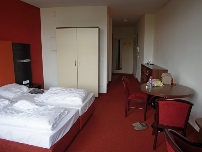 ライプツィヒ中央駅の目の前にあります。道路が工事中ですが、見上げればそこそこのクラシックな建物です。この2階(外から見ると3階)の一番左の部屋に泊まりました。