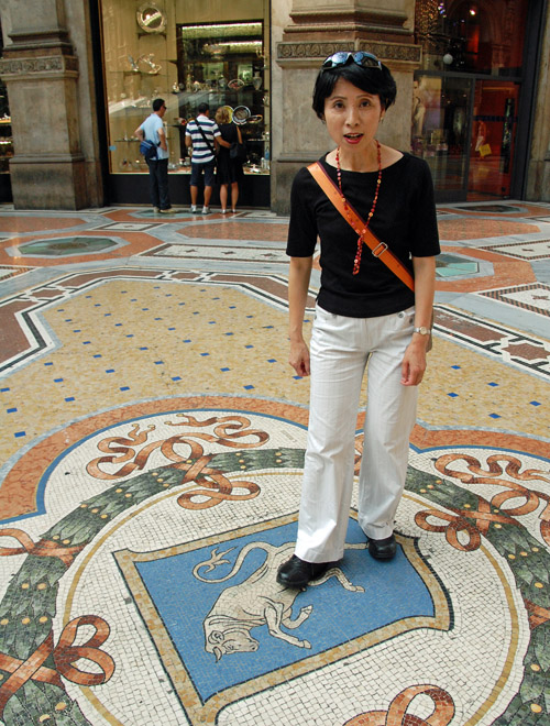 床はきれいなモザイクで覆われています。中心部の雄牛の局部にかかとをのせて一回転すると、願い事が叶うそうです。
